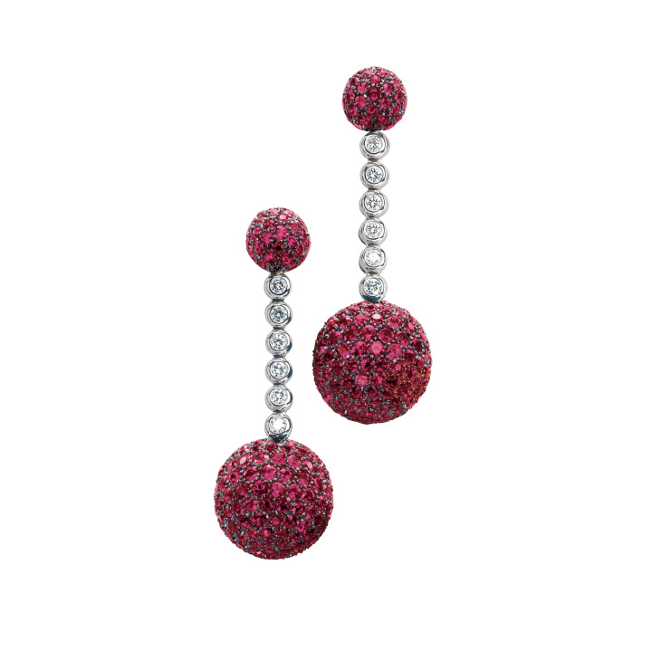 Серьги de Grisogono, коллекция Boule. Серьги из белого золота 750 пробы с белыми бриллиантами и рубинами.