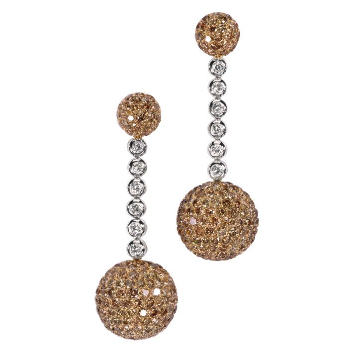 Серьги de Grisogono, коллекция Boule. Серьги из белого и желтого золота 750 пробы с белыми и коричневыми бриллиантами.