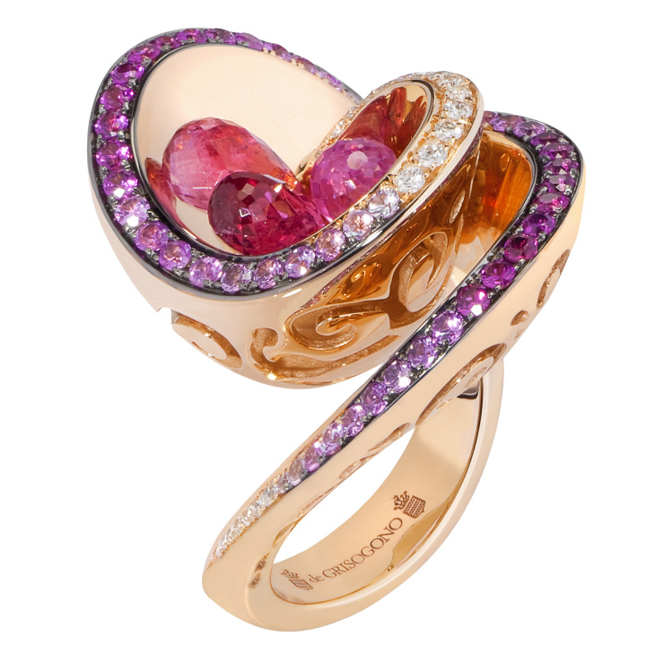 Кольцо de Grisogono, коллекция Chiocciolina. Кольцо из розового золота 750 пробы с белыми бриллиантами, розовыми сапфирами, розовыми сапфирами огранки «бриолет» и рубеллитами огранки «бриолет».