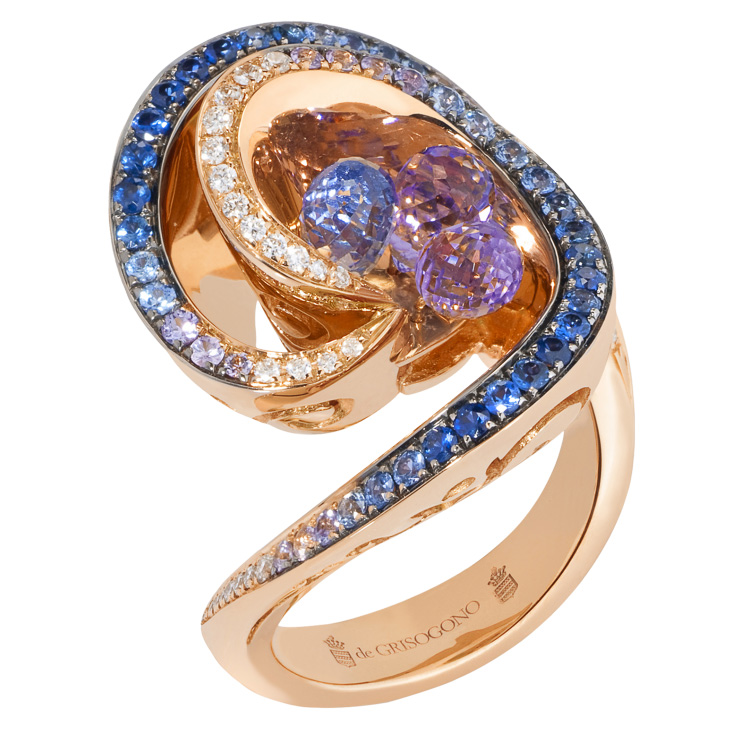 Кольцо de Grisogono, коллекция Chiocciolina. Кольцо из розового золота 750 пробы с белыми бриллиантами, синими сапфирами, синим сапфиром огранки «бриолет» и аметистами огранки «бриолет».