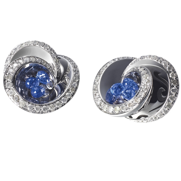 Серьги de Grisogono, коллекция Chiocciolina. Серьги из белого золота 750 пробы с белыми бриллиантами Icy и синими сапфирами огранки «бриолет».