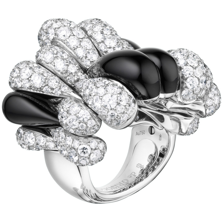 Кольцо de Grisogono, коллекция Gocce. Кольцо из белого золота 750 пробы с белыми бриллиантами и черным кварцем.
