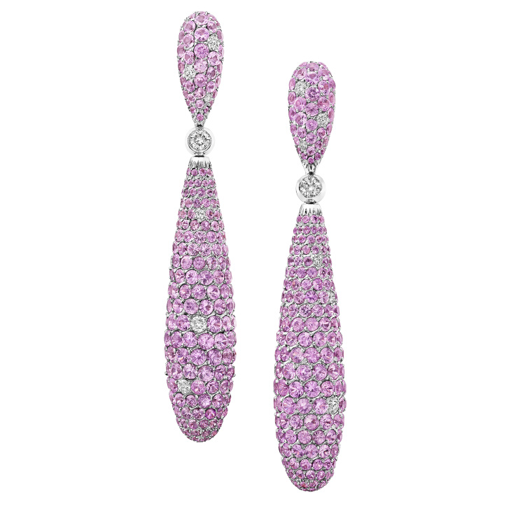 Серьги de Grisogono, коллекция Gocce. Серьги из белого золота с белыми бриллиантами и розовыми сапфирами.
