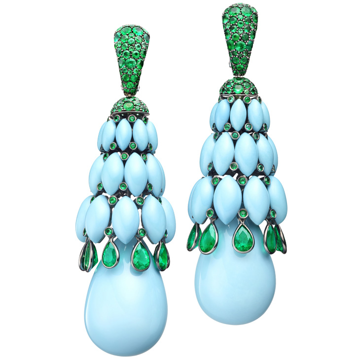 Серьги de Grisogono, коллекция Melody Of Colours. Серьги из белого золота с изумрудами, изумрудами грушевидной огранки и каплевидными элементами из бирюзы.
