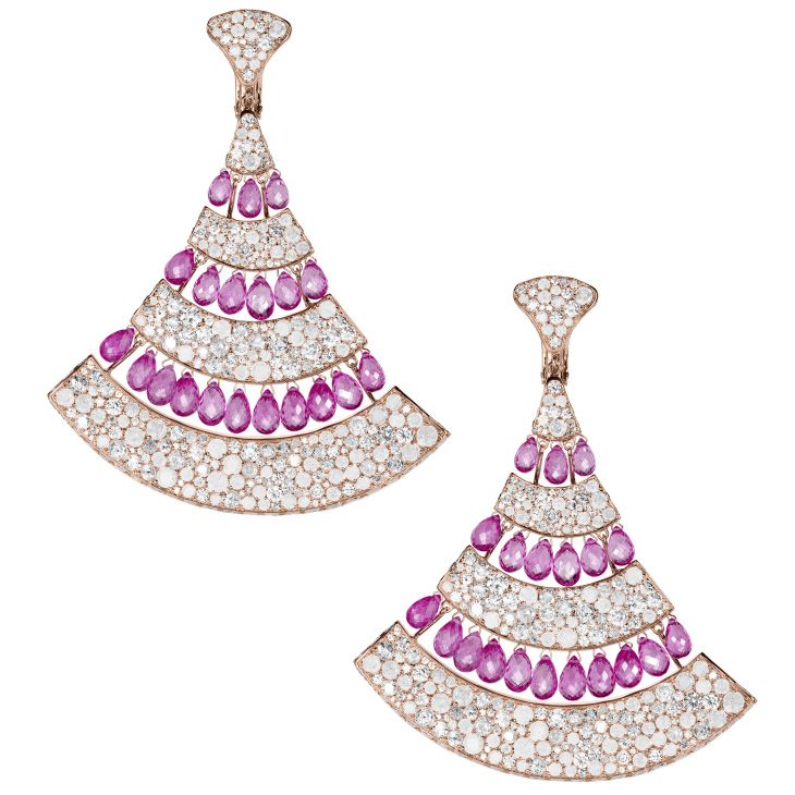 Серьги de Grisogono, коллекция Melody Of Colours. Серьги из розового золота с 216 белыми бриллиантами, 480 белыми бриллиантами ICY и 40 розовых сапфиров огранки «бриолет».