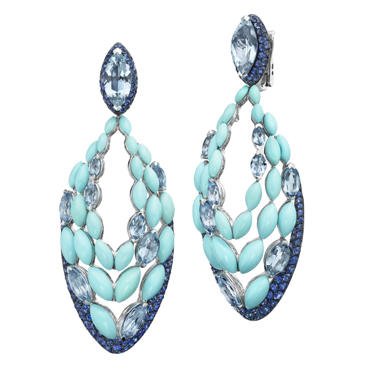 Серьги de Grisogono, коллекция Melody Of Colours. Серьги из белого золота, аквамарин огранки «маркиза», бирюза огранки «кабошон», синий сапфир.