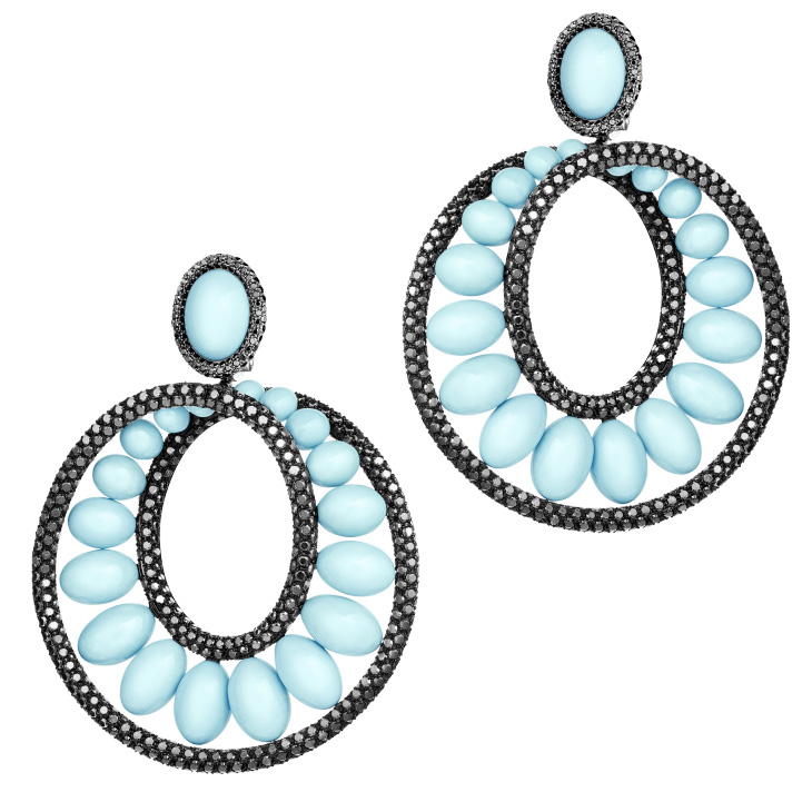 Серьги de Grisogono, коллекция Melody Of Colours. Серьги из белого золота и титана. 1186 черных бриллиантов, 38 элементов из бирюзы.