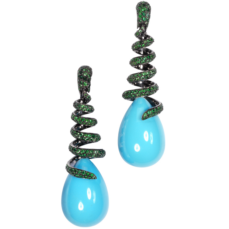 Серьги de Grisogono, коллекция Melody Of Colours. Серьги из белого золота с изумрудами и каплевидными элементами из бирюзы.