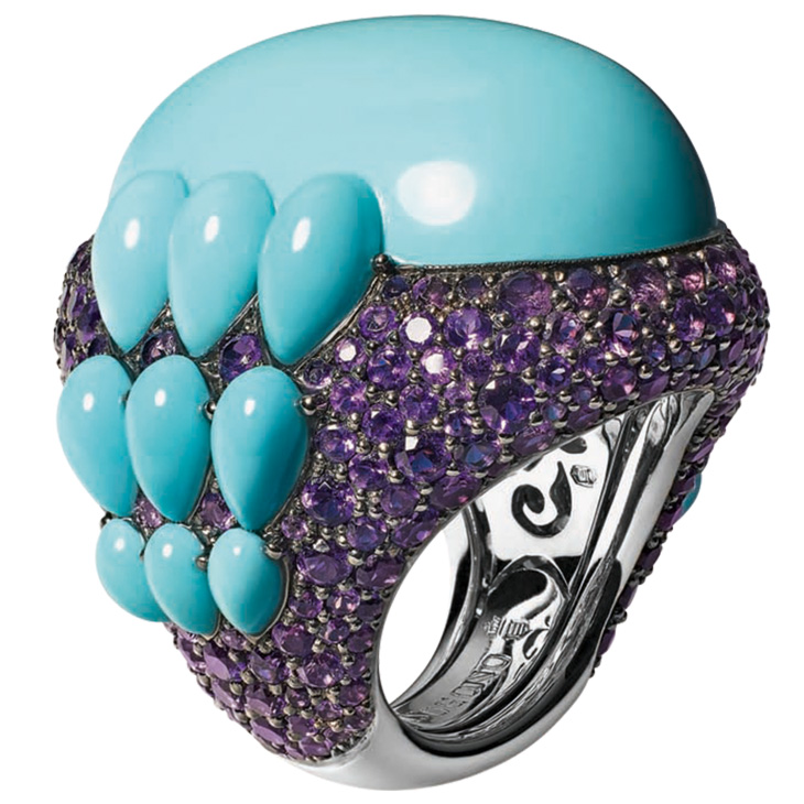 Кольцо de Grisogono, коллекция Melody Of Colours. Кольцо из белого золота с аметистами и бирюзой.
