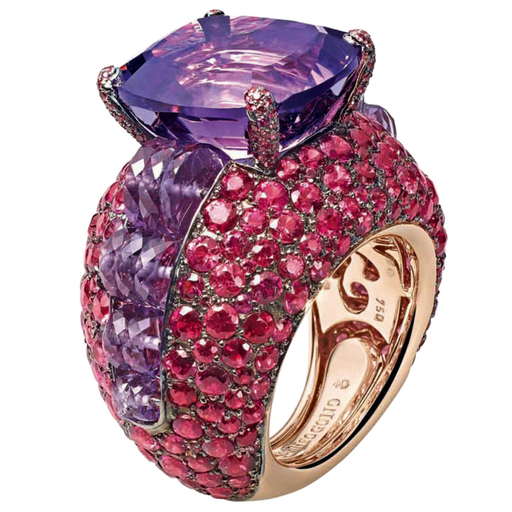 Кольцо de Grisogono, коллекция Melody Of Colours. Кольцо из розового золота с розовыми турмалинами, белыми бриллиантами, розовыми и оранжевыми сапфирами.