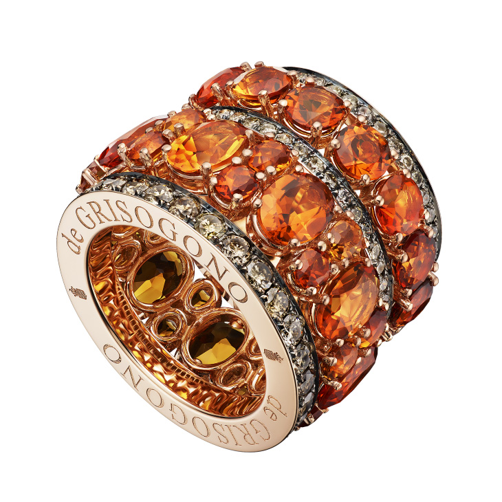 Кольцо de Grisogono, коллекция Melody Of Colours. Кольцо из розового золота с цитринами овальной огранки, цитринами круглой огранки, коричневыми бриллиантами.