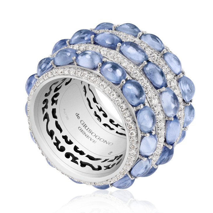 Кольцо de Grisogono, коллекция Melody Of Colours. Кольцо из белого золота. 440 белых бриллиантов, 45 голубых сапфиров огранки «кабошон».
