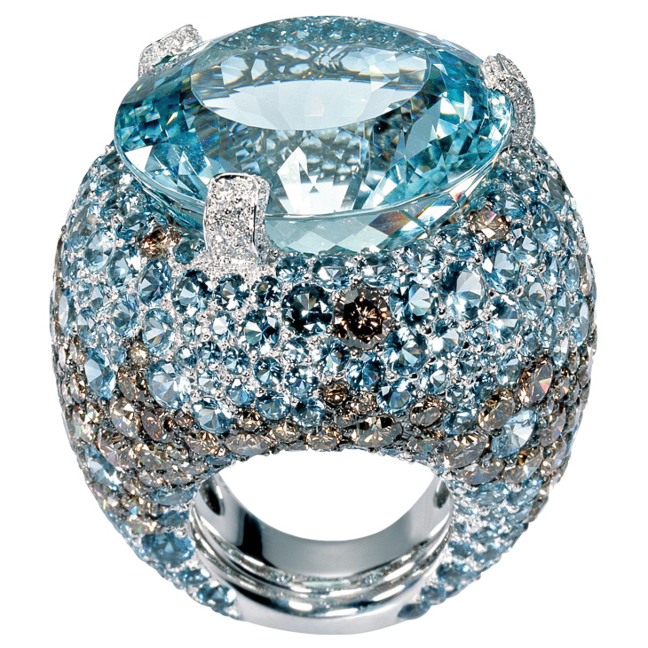 Кольцо de Grisogono, коллекция Melody Of Colours. Кольцо из белого золота с аквамаринами, коричневыми и белыми бриллиантами.