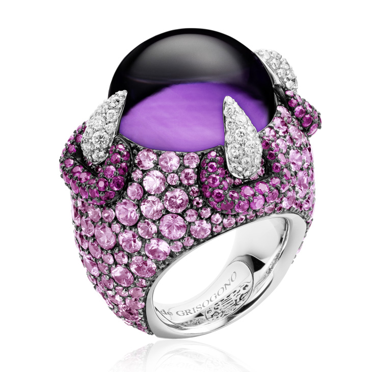 Кольцо de Grisogono, коллекция Melody Of Colours. Кольцо из белого золота с аметистом огранки «кабошон». 72 белых бриллианта, 370 розовых сапфиров.