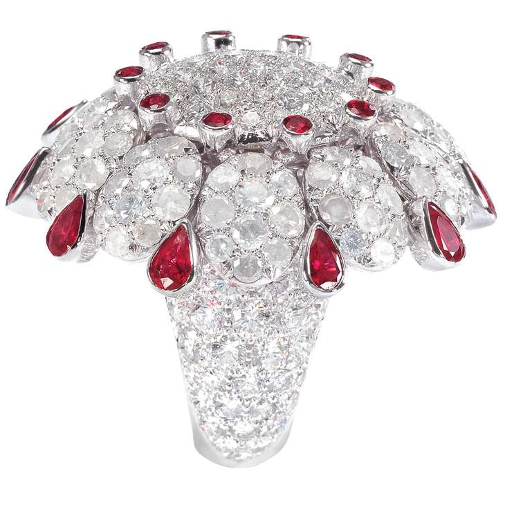 Кольцо de Grisogono, коллекция Melody Of Colours. Кольцо из белого золота с белыми бриллиантами, белыми бриллиантами Icy и рубинами.