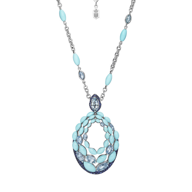 Колье de Grisogono, коллекция Melody Of Colours. Колье из белое золота, аквамарин огранки «маркиза», бирюза огранки «кабошон», синий сапфир.