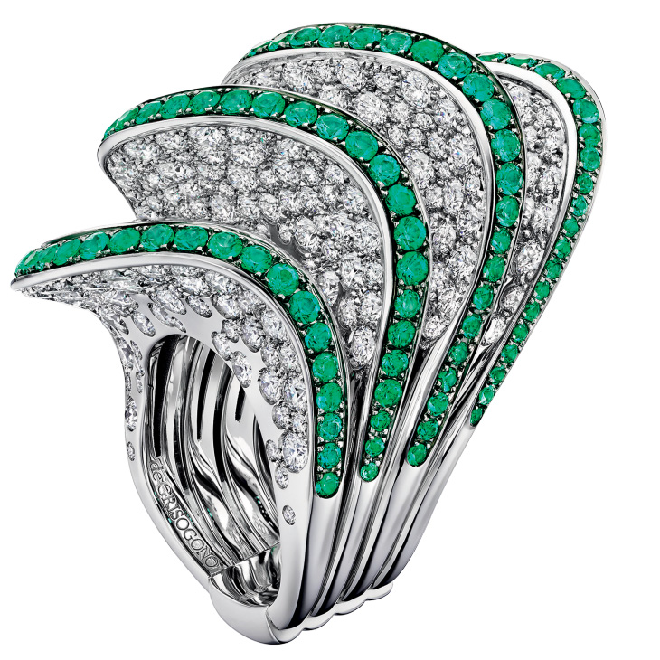 Кольцо de Grisogono, коллекция Onde. Кольцо из белого золота 750 пробы с изумрудами и белыми бриллиантами.