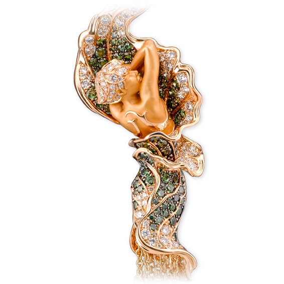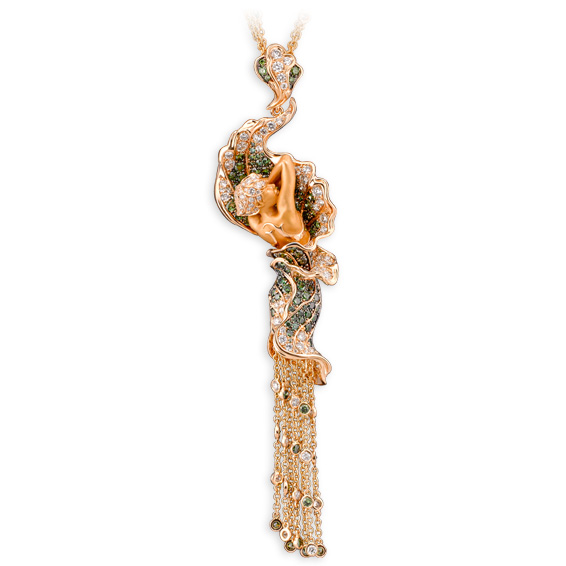 Подвеска Veris из коллекции Magerit Gea. Подвеска из желтого золота с белыми, зелеными бриллиантами и агатами.