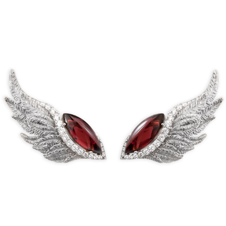 Серьги Magerit Armonia из коллекции Hechizo. Серьги из белого золота с бриллиантами и гранатом.