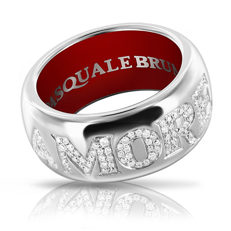 Кольцо Pasquale Bruni из коллекции Amore. Кольцо из белого золота с надписью "Amore", белыми бриллиантами и с красной эмалью на внутренней стороне.