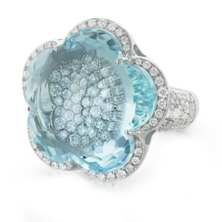 Кольцо Pasquale Bruni из коллекции Bon Ton Haute Couture. Кольцо из белого золота с аквамарином в виде цветка и белыми бриллиантами.