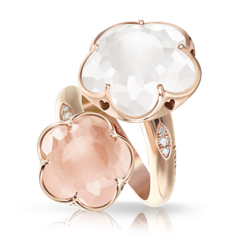 Кольцо Pasquale Bruni из коллекции Bon Ton. Кольцо из розового золота с с розовым и молочным кварцам халцедоном в виде цветков и белыми бриллиантами.