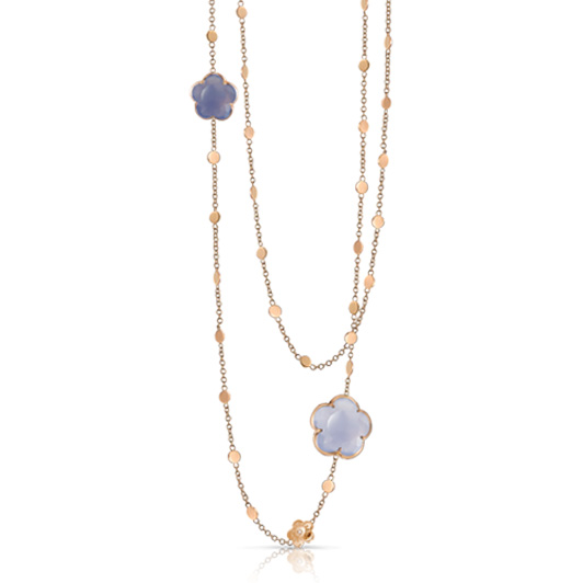 Ожерелье Pasquale Bruni из коллекции Bon Ton. Ожерелье из розового золота с голубыми кварцами халцедонами в виде цветков, кварцами круглой формы и белыми бриллиантами.