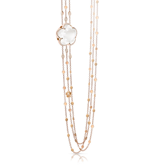 Ожерелье Pasquale Bruni из коллекции Bon Ton. Длинное ожерелье из розового золота с молочным кварцам халцедоном в виде цветка и белыми бриллиантами.