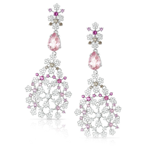 Серьги Pasquale Bruni из коллекции Flowers in Bloom. Серьги из белого золота с морганитом, розовыми сапфирами, белыми бриллиантами и бриллиантами цвета "шампань".