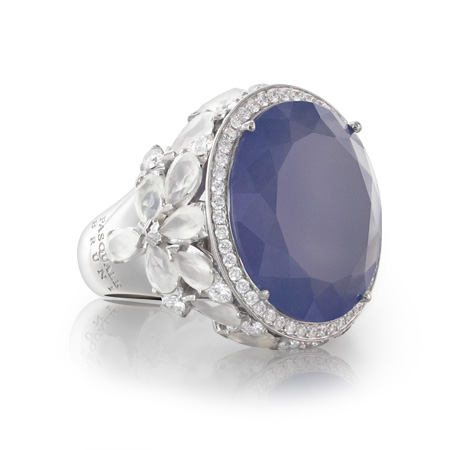 Кольцо Pasquale Bruni из коллекции Ghirlanda. Кольцо из белого золота с темно-синим халцедоном, белыми агатами и белыми бриллиантами.