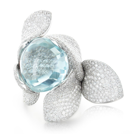 Кольцо Pasquale Bruni из коллекции Secret Gardens Haute Couture. Кольцо из белого золота с белыми бриллиантами и аквамарином.