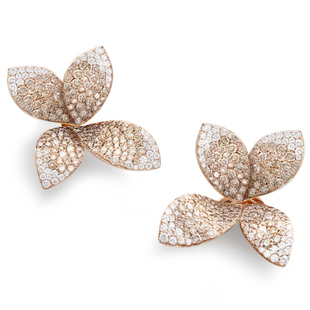 Серьги Pasquale Bruni из коллекции Giardini Segreti. Серьги из розового золота с белыми бриллиантами и бриллиантами цвета "шампань". Изогнутые линии листков создают чувственный цветочный мотив характерный для серии Pasquale Bruni Giardini Segreti.