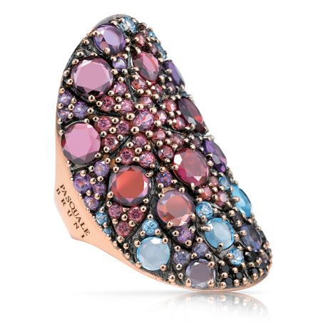 Кольцо Pasquale Bruni из коллекции Mandala. Кольцо из розового золота с аметистами, иолитами, родолитами, голубыми топазами и шпинелью черного цвета.