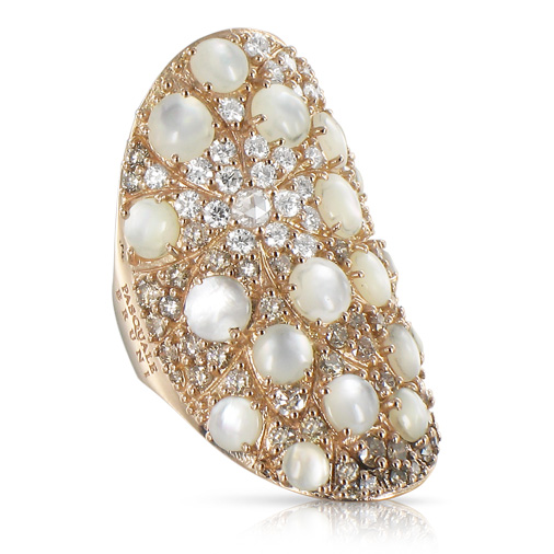 Кольцо Pasquale Bruni из коллекции Mandala. Кольцо из розового золота с жемчугом, белыми бриллиантами и бриллиантами цвета "шампань".