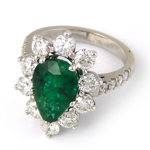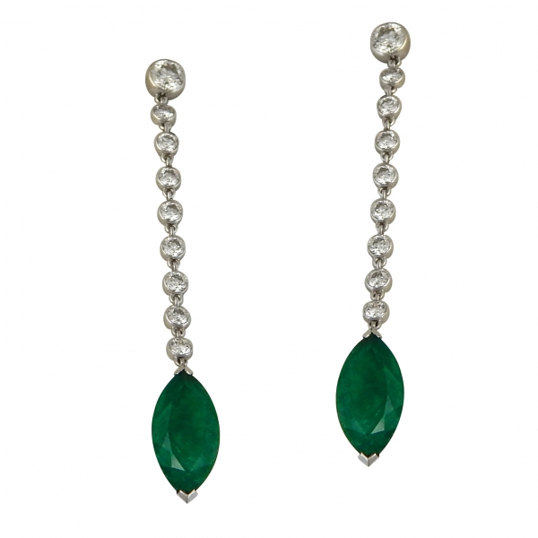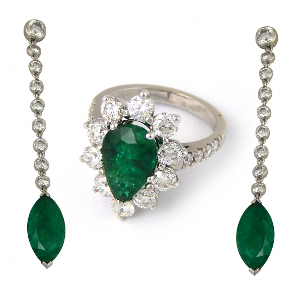 Описание Crivelli sada earrings and ring, 18K white gold Earrings, 1.3ct diamonds, 7ct emeralds Ring, 1.8ct diamonds, 4.2ct emerald