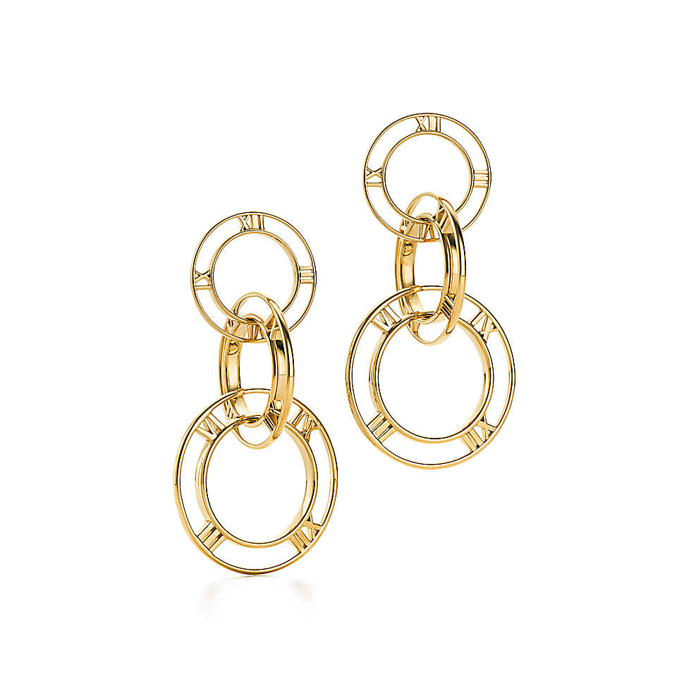 Сочетание выразительных линий и римских цифр — в современном украшении, посвященном одному из символов Tiffany. Серьги Tiffany & Co Atlas™ ref: 32995241 из желтого золота, 18 K.