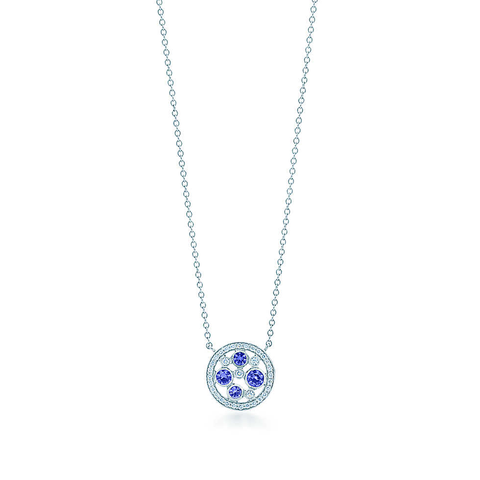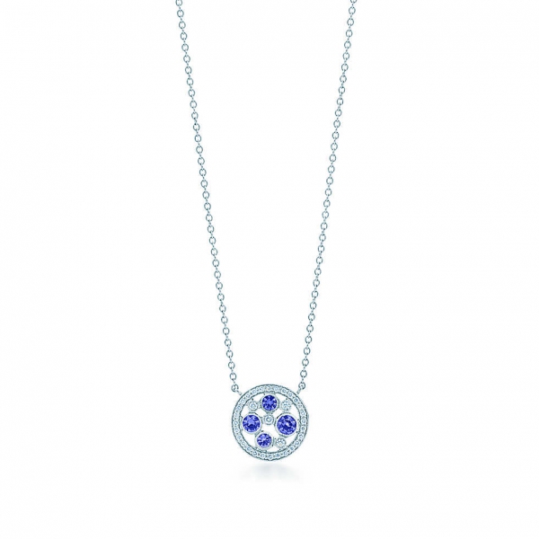Блистательное украшение усыпано изящными бриллиантами и сапфирами разных размеров. Подвеска Tiffany Cobblestone ref: 29006423 из платины с сапфирами из штата Монтана и бриллиантами. На цепочке длиной 40,5 см. Круглые сапфиры, общий вес в каратах 0,25; круглые бриллианты, общий вес в каратах 0,08.