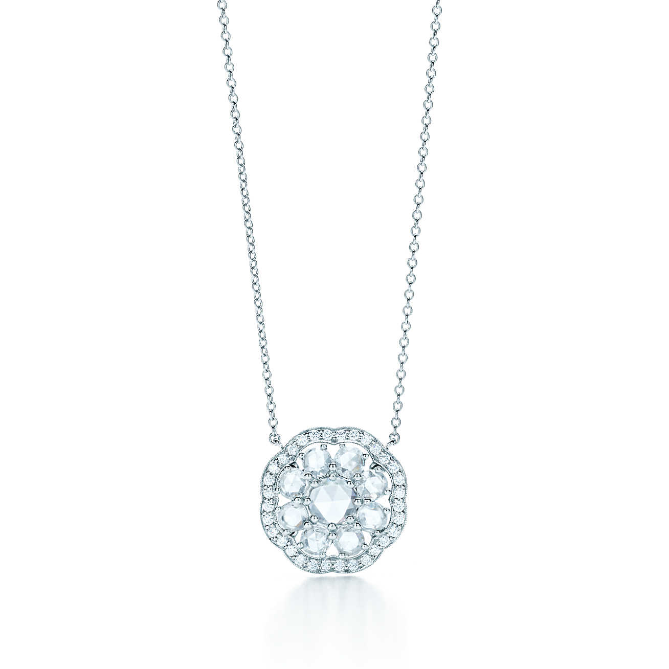 Бриллианты в огранке «Роза» окаймляют сияющий центральный камень, как прекрасные цветы. Подвеска "Флёр" Tiffany Enchant ref: 31723051. Платина с круглыми бриллиантами и бриллиантами в огранке «Роза». Длина цепочки - 40,5 см. Общий вес в каратах - 1,05.