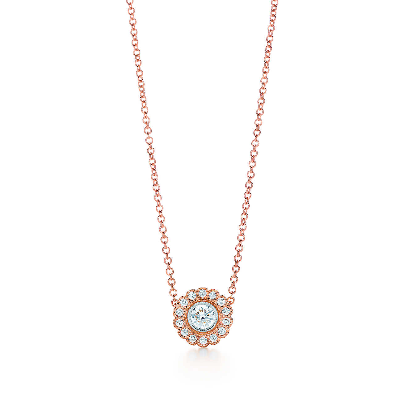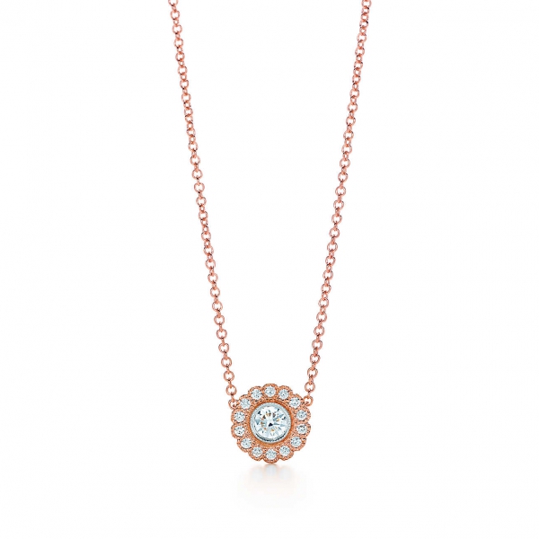 Великолепные бриллианты украшают сияющий центральный камень, как прекрасные цветы. Подвеска Tiffany Enchant ref: 29045372 из платины и розового золота, 18 K, с круглыми бриллиантами. Общий вес в каратах 0,25.