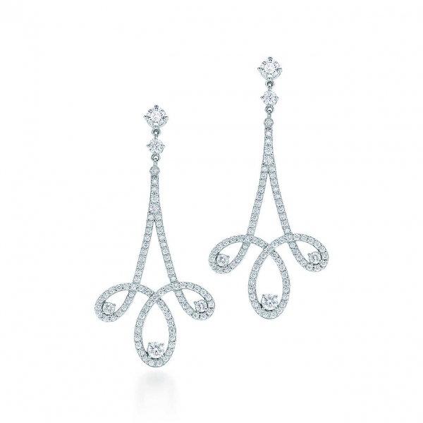 Серьги с завитками Tiffany Enchant ref: 28910126. Бриллианты в платиновой оправе украшают романтичные завитки серег, выполненных в стиле орнамента на воротах садов образца XIX века. Круглые бриллианты, общий вес в каратах 1,22.