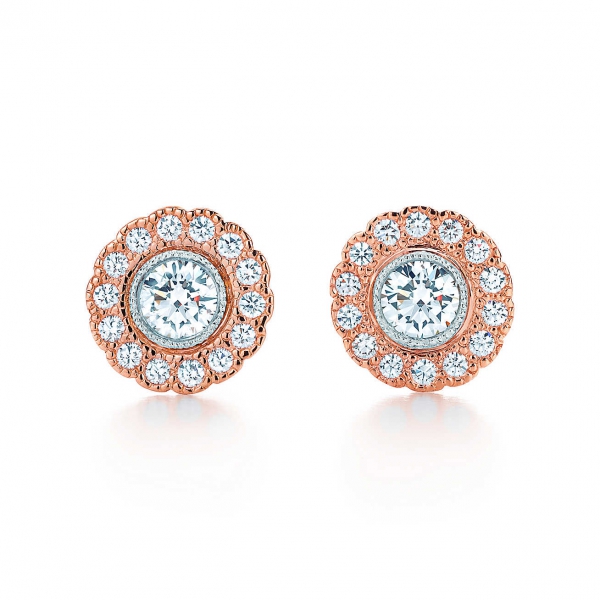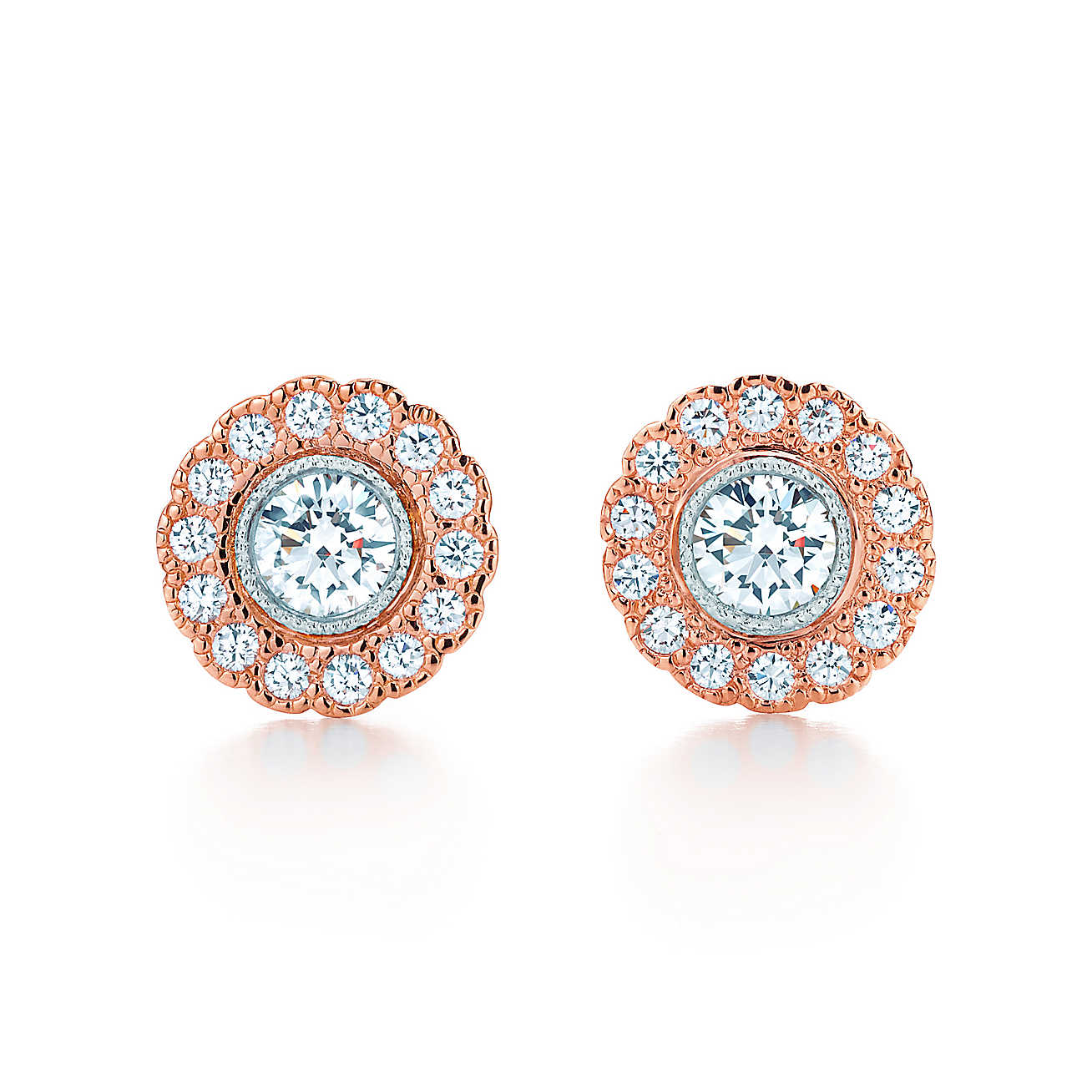 Великолепные бриллианты украшают сияющий центральный камень, как прекрасные цветы. Серьги Tiffany Enchant ref: 29045399 из платины и розового золота, 18 K, с круглыми бриллиантами. Общий вес в каратах 0,51.