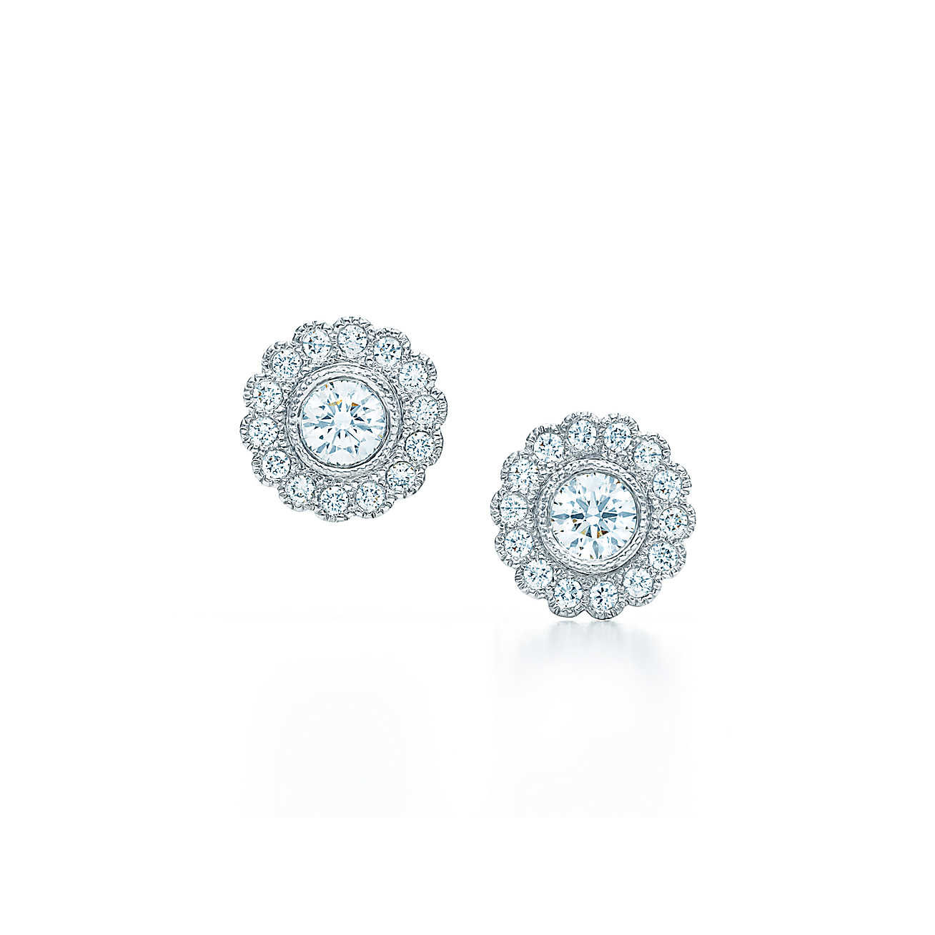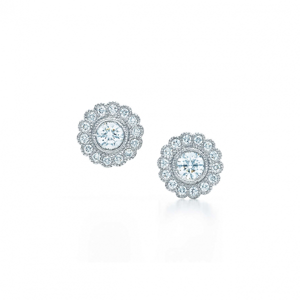 Великолепные бриллианты украшают сияющий центральный камень, как прекрасные цветы. Серьги Tiffany Enchant ref: 29527857 из платины с круглыми бриллиантами. Общий вес в каратах 0,51.