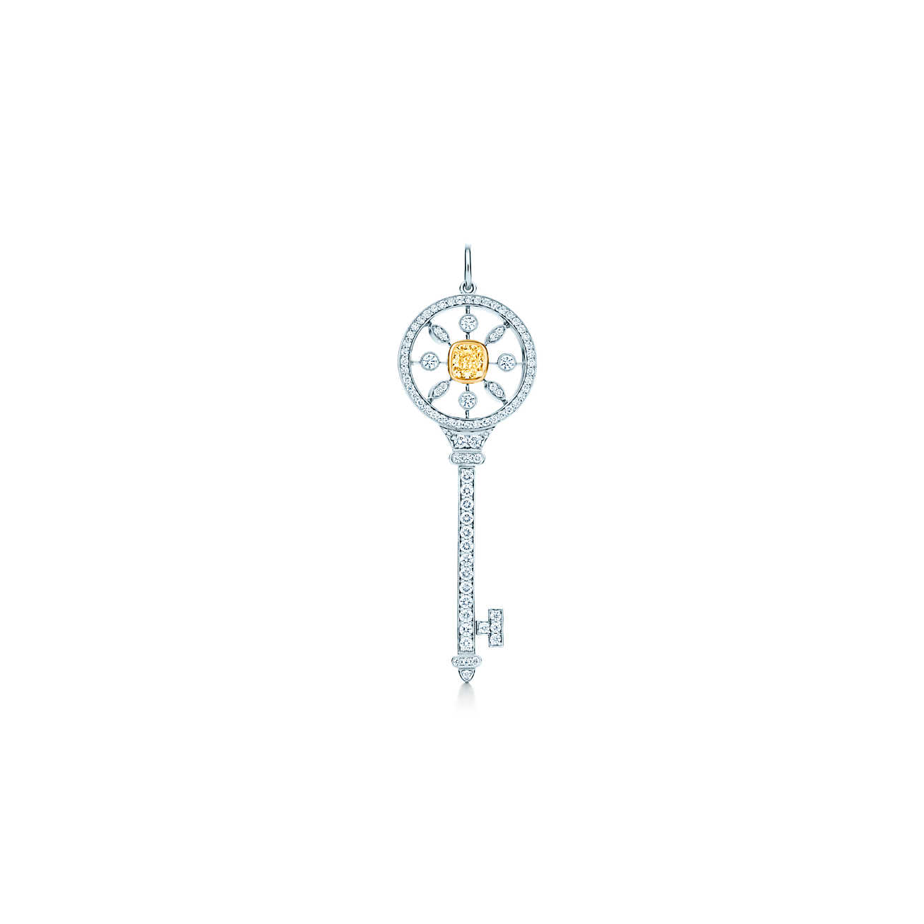 Круглая подвеска-ключ Tiffany Keys ref: 26988284 с калейдоскопическим узором, платина и 18-каратное золото, желтый бриллиант в огранке «Кушон» и белые круглые бриллианты. Длина 5 см.