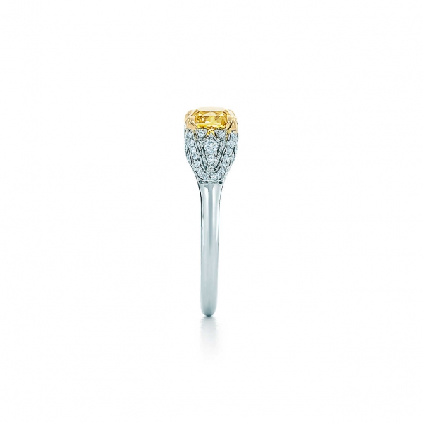 Яркий желтый бриллиант Tiffany, излучающий свет сродни золотым солнечным лучам, украшает кольцо в стиле «ревущих двадцатых». Кольцо Tiffany Yellow Diamonds ref: 30651278 в стиле "Ар-деко" из платины и золота, 18 K с желтым и белыми бриллиантами.