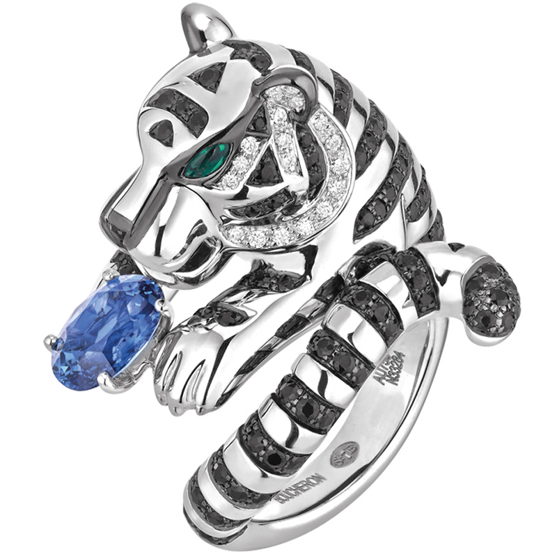 Каблучка Boucheron Animals Bagha, біле золото, смарагд, діаманти, сапфіри