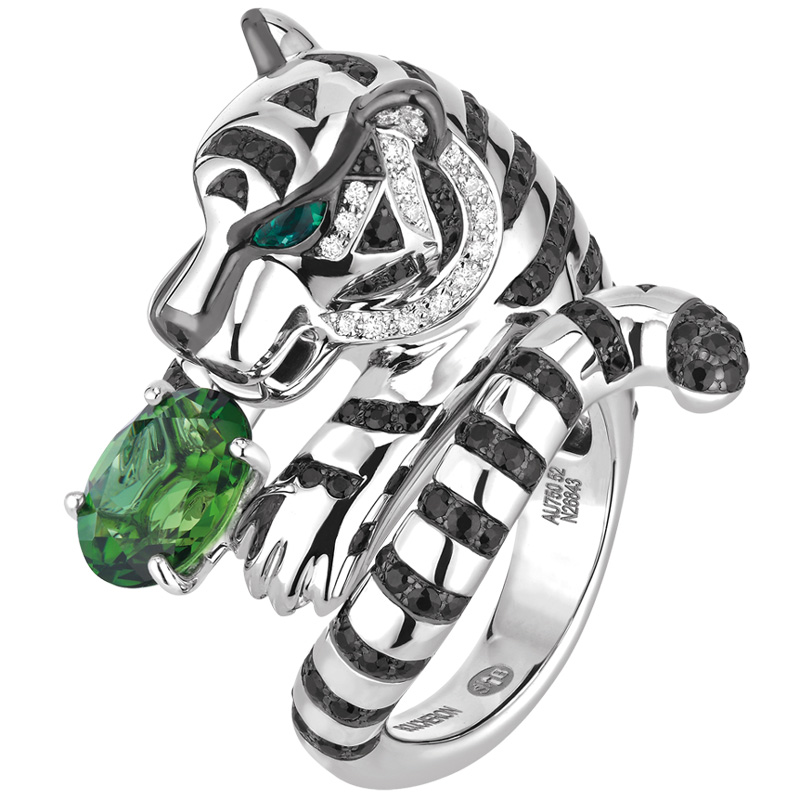 Каблучка Boucheron Animals Bagha, біле золото, смарагд, діаманти, сапфіри