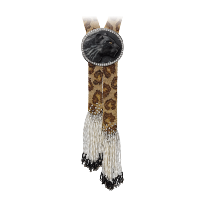 Опис Кольє, платина, вишивка золотою ниткою по шовку, смугастий агат, опал (око), перли культивовані, діаманти огранювання “бріолет”, діаманти класичного огранювання