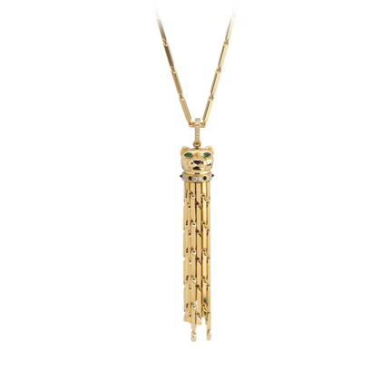 Опис Кольє з жовтого золота 18 карат, діаманти, смарагди (очі), онікс (ніс), чорний лак (плями)