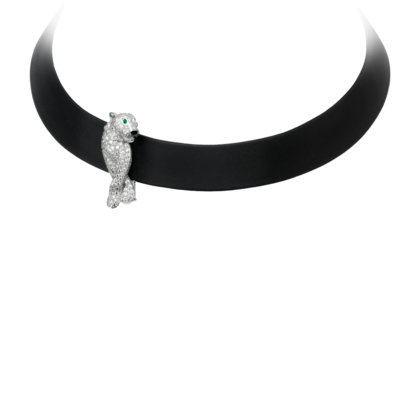 Опис Кольє з білого золота 18 карат з діамантами, мотив "пантера", смарагди (очі) та онікс (ніс), чорна тканина, що переливається Декоративний елемент "пантера" можна носити як брошку