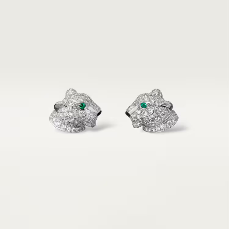 Опис Сережки з білого золота 18К у формі пантери з діамантовим паве 126 діамантів, 2 смарагди (очі), 2 оніксу (ніс) Висота голови пантери: 10,8 мм x ширина: 12,7 мм